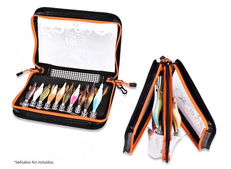 El Estuche Egi Cover Doble de Sakura es la solución ideal para guardar y organizar tus egis durante las jornadas de pesca de calamares o sepias. Su formato compacto permite almacenar hasta 20 egis en ranuras preformadas de placa de EVA, mientras que la tapa transparente facilita ver el contenido al instante.