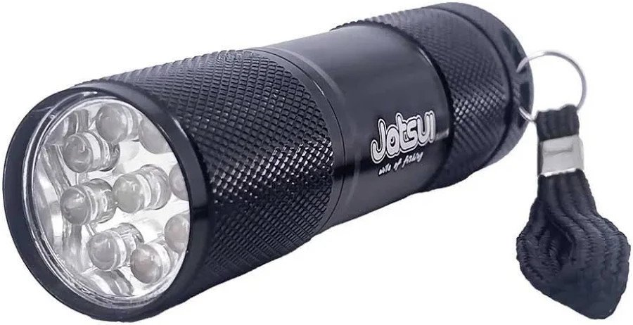 Linterna LED UV JATSUI 9 con 9 LEDs UV, 1000 lúmenes y alcance de 500 metros. Compacta, resistente al agua y con modos alto, bajo y estroboscópico. Ideal para camping, senderismo y uso profesional.