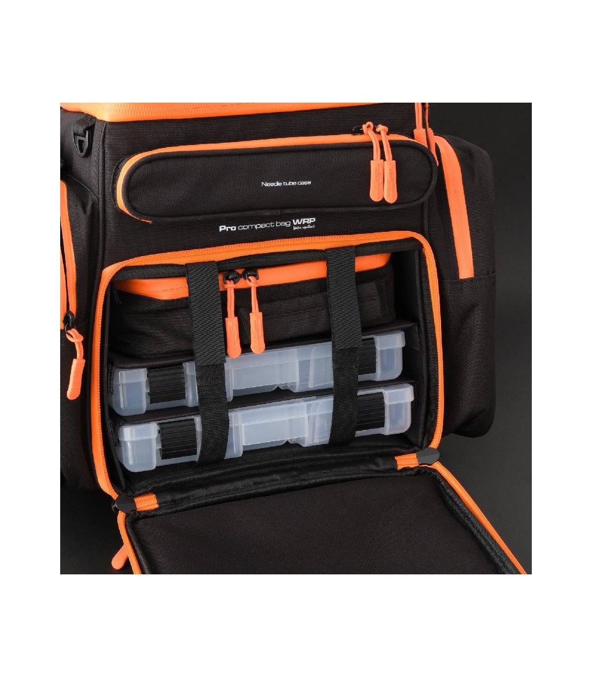 Su diseño está pensado para una organización eficiente del material. Dispone de un amplio bolsillo central con separadores de velcro, ideal para adaptar el espacio según el equipo que transportes. También incluye un estuche exterior tipo “needle tube case”, perfecto para guardar agujas de cebado y herramientas alargadas de forma segura.
