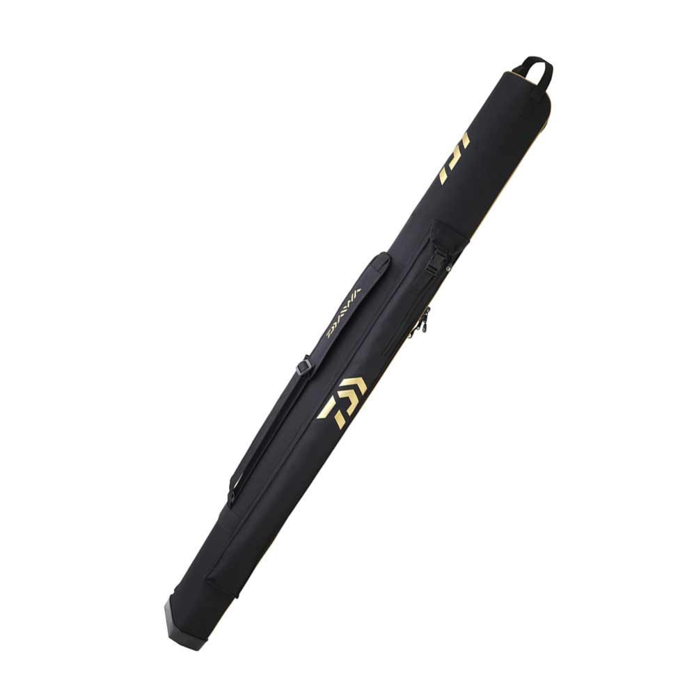 Saco Daiwa Fourreau Rígido 160CM Black-Gold: capacidad para 3 cañas de surfcasting, diseño semi-rígido resistente a golpes, arena y agua salada, con correa acolchada, asa reforzada y acabado premium negro/dorado.